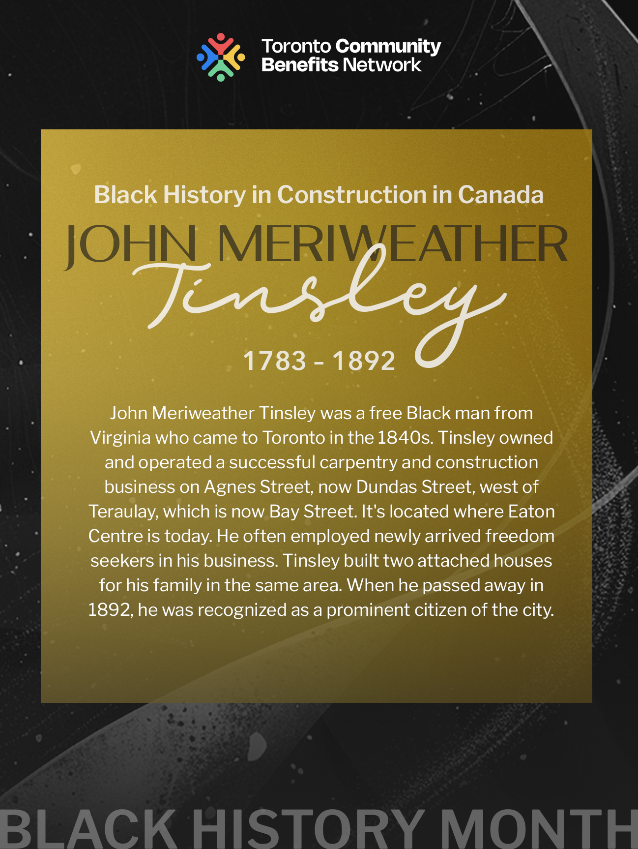 John Meriweather Tinsley was a free Black man from Virginia who came to Toronto in the 1840s. Tinsley purchased property in St. John’s Ward. He built a pair of attached houses for his family near the corner of Terauley (now Bay) and Agnes (Dundas) Streets and started his own construction company. Tinsley added to his real estate holdings over time by constructing a series of cottages and tenements in the district. He often employed newly arrived freedom seekers in his business. When he passed away in 1892, he was recognized as a prominent citizen of the city.